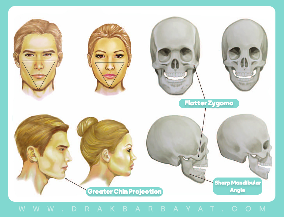 من جهة أخرى، يكون الهيكل العظمي للوجه لدى الرجال أكثر بروزًا، مع زاوية فكّ أكثر وضوحًا، كما أن العضلات تكون أكثر سماكة في حين تكون كمية النسيج الدهني أقل.