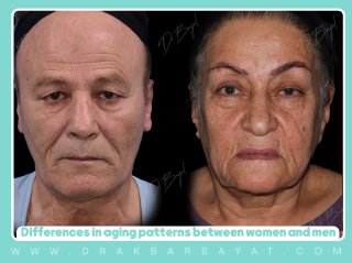 أمّا لدى الرجال، فتظهر التغيّرات بشكل أوضح في الجزء السفلي من الوجه وأعلى الرقبة. ويُعدّ ترهّل الجلد تحت الذقن، واختفاء زاوية الفك، وتجمّع الدهون في هذه المنطقة من العلامات البارزة للشيخوخة عند الرجال.