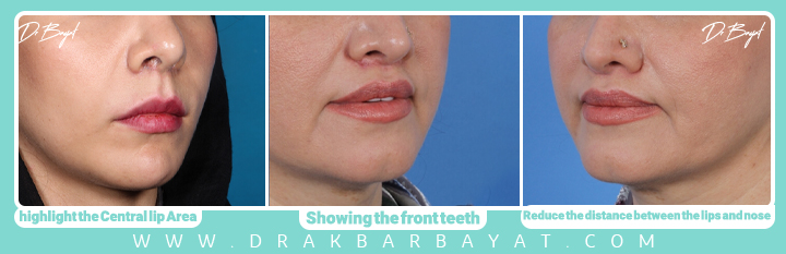 Often, in addition to the above issue, these individuals have a large distance between their nose and lip. The best option for them is an upper lip lift (central upper lip lift). Many of these patients, due to their occupations (such as cinema artists, television presenters, etc., who are constantly in front of cameras and a large audience), do not want others to know about the surgeries or cosmetic procedures they undergo.